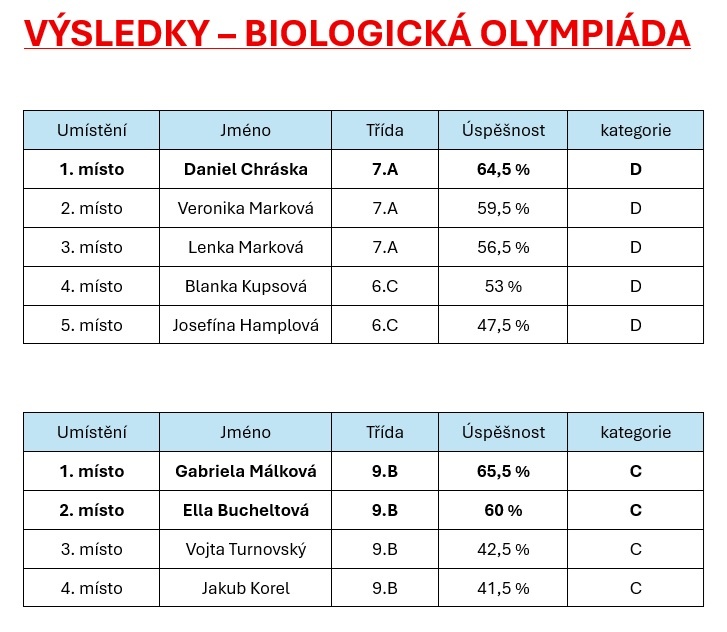 Dne 21. 1. se na Bezručce tradičně konala Biologická olympiáda. Součástí byl teoretický test, poznávání rostlin a živočichů a laboratorní práce. Nejúspěšnějšími řešiteli se stali Daniel Chráska ze 7.A v kategorii D a Gabriela Málková z 9.B v kategorii C.