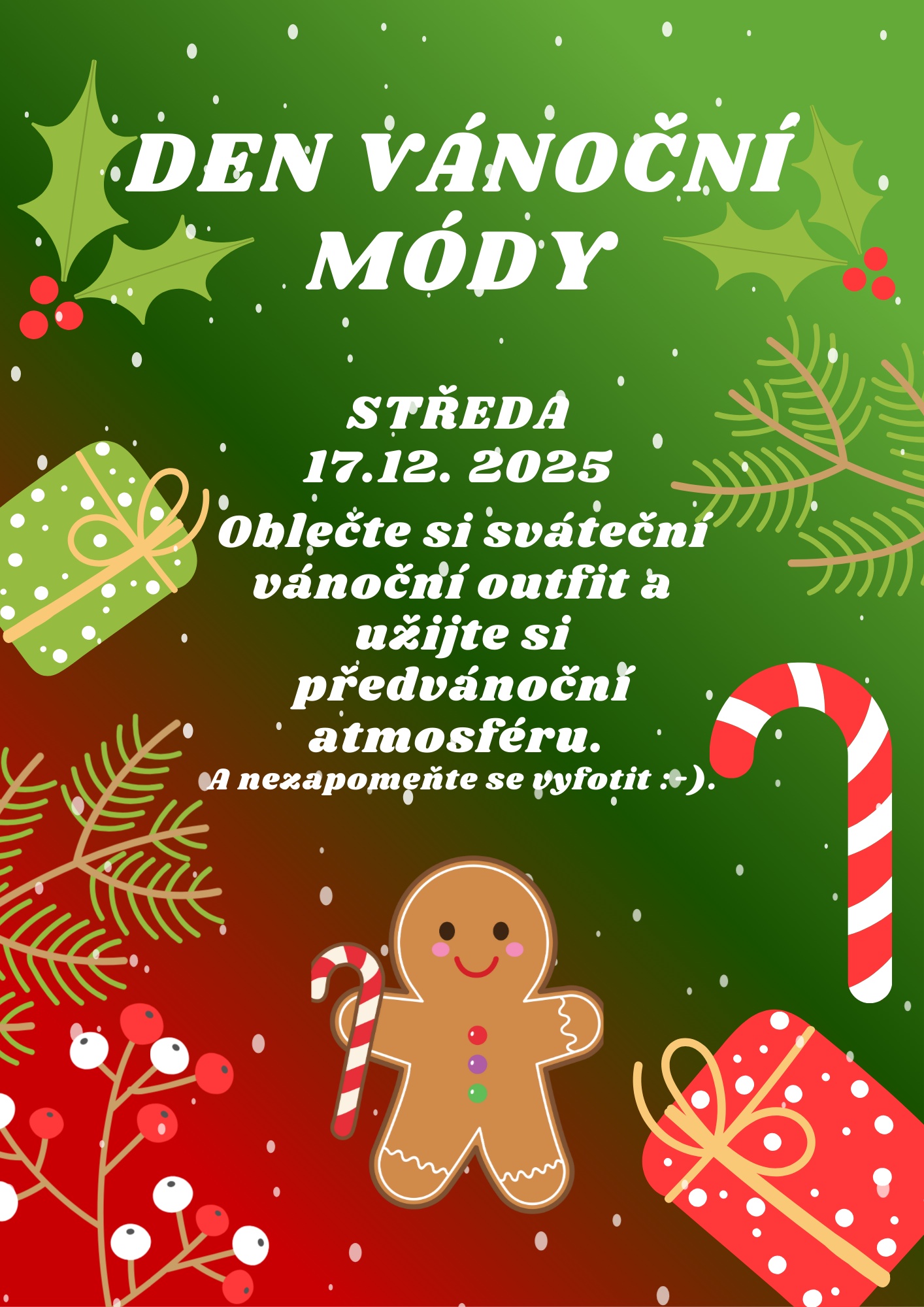 Ve středu 17. prosince 2025 vyhlašuje školní parlament předvánoční akci – Den vánoční módy. Užijme si atmosféru tohoto období ve slavnostně laděném oblečení! Můžete také přijít s vánočními doplňky. Nezapomeňte se vyfotit. Kouzelnou atmosféru adventu přeje školní parlament.